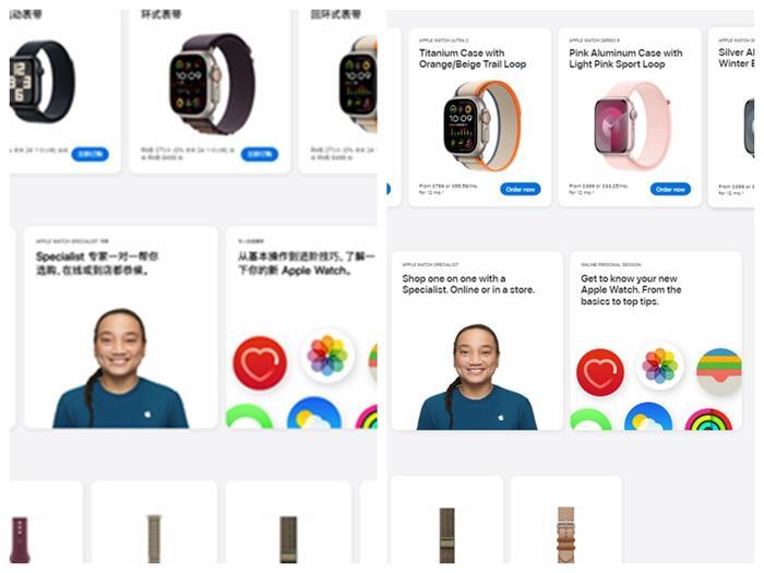 苹果中国官网和美国官网展示对比。苹果官网截图