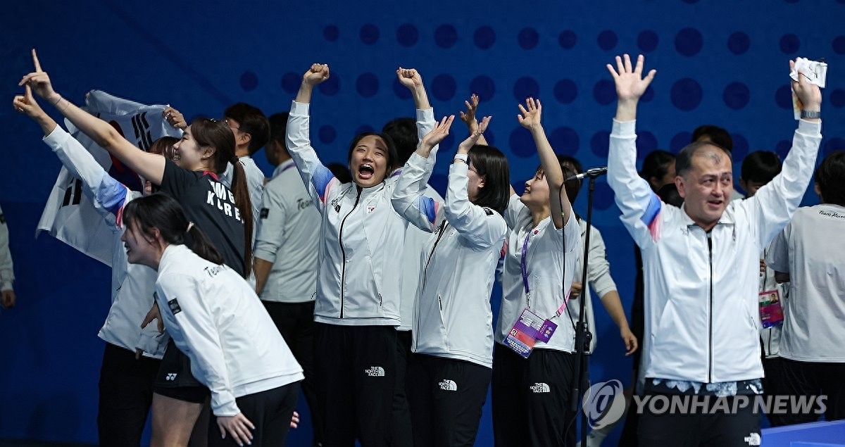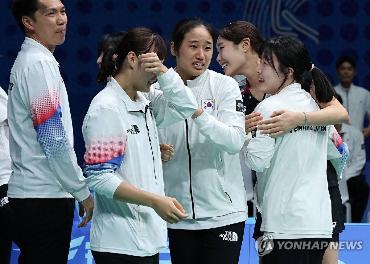 1日,在杭州亚运会羽毛球女子团体决赛中,在与中国队的比赛中获胜并获得金牌的韩国选手们流下了激动的泪水