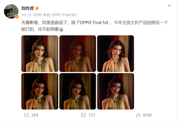 在影像上,使用了4800万像素的双层晶体管LYT808大底主摄以及64Mp OV64B潜望镜长焦,支持3X光变以及6X无损变焦。同时有哈苏影像系统加持,刘作虎称在影像上,今年的主流大折产品拍照没有一个可以和OPPO Find N3过招。