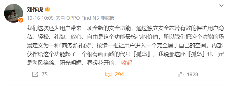 在配置上,OPPO Find N3搭载了高通骁龙8 Gen 2的处理器,采用了2K+120HZ+1440PWM高频调光的京东方“钻石屏”,亮度最高达2800尼特,是行业内最高水准。同时可折叠次数也远超友商竞品。值得一提的是,OPPO Find N3还内置了一块独立安全芯片,据刘作虎称,这块安全芯片将有效的保护用户的隐私,OPPO将这个功能场景定义成是一种“商务新礼仪”。
