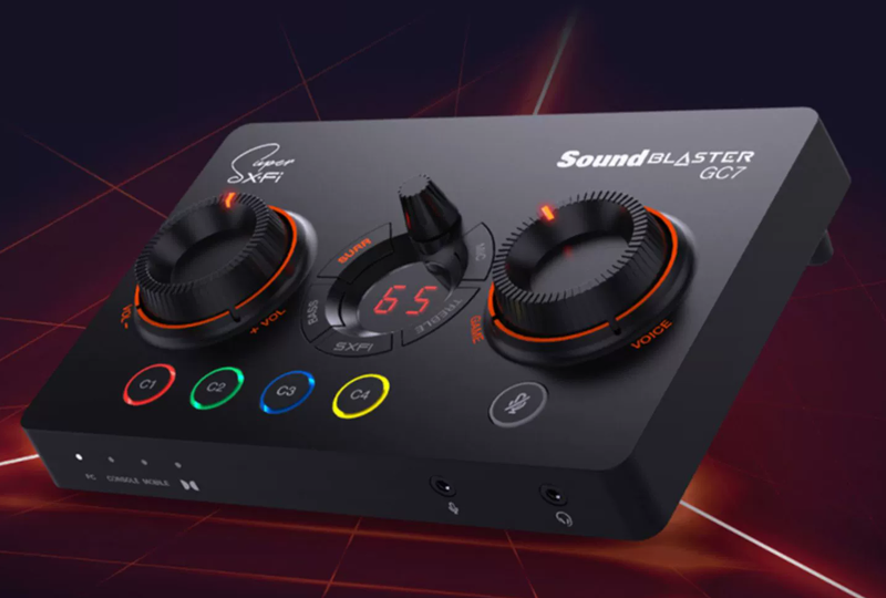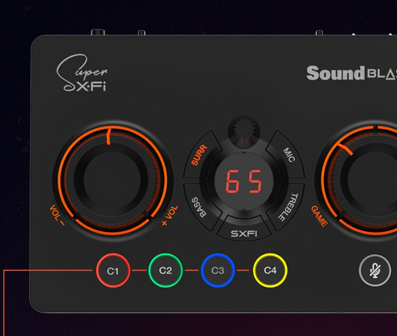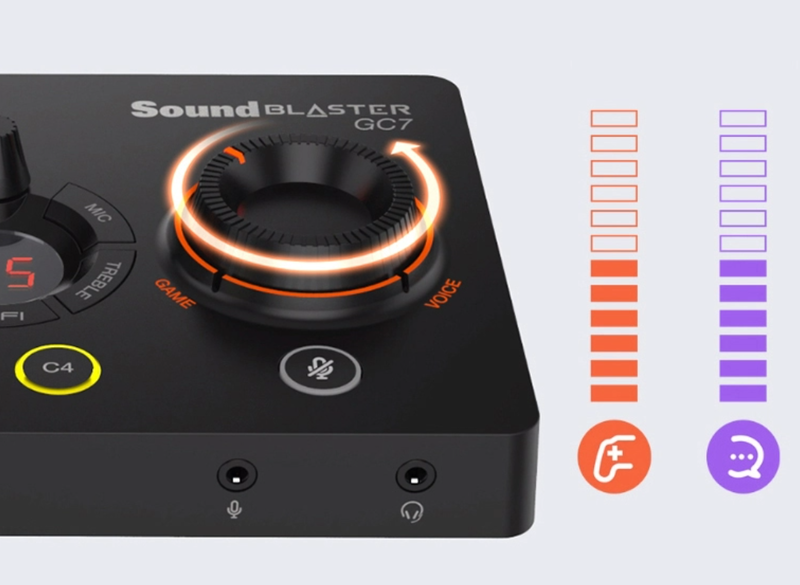 更值得一提的是,Sound Blaster GC7的主体上设有四个可自定义的按钮,你可以根据自己的需求来设定每个按钮的功能。除了这四个可编程按钮之外,它还集成了整套易于访问的控件,可以让你轻松切换声音模式。所有的操控都触手可及,你可以随心所欲地切换声音模式,得到更好的游戏体验。