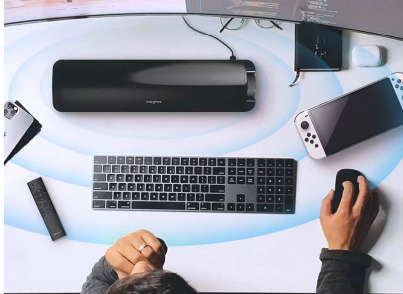 回到家中,想要有更好的影音体验,你需要一款好的桌面音箱,这里给大家推荐创新Stage SE。这款音箱采用了独特的条形设计,非常节省桌面空间,你可以轻易地将其放置在显示器下方,既美观又实用。