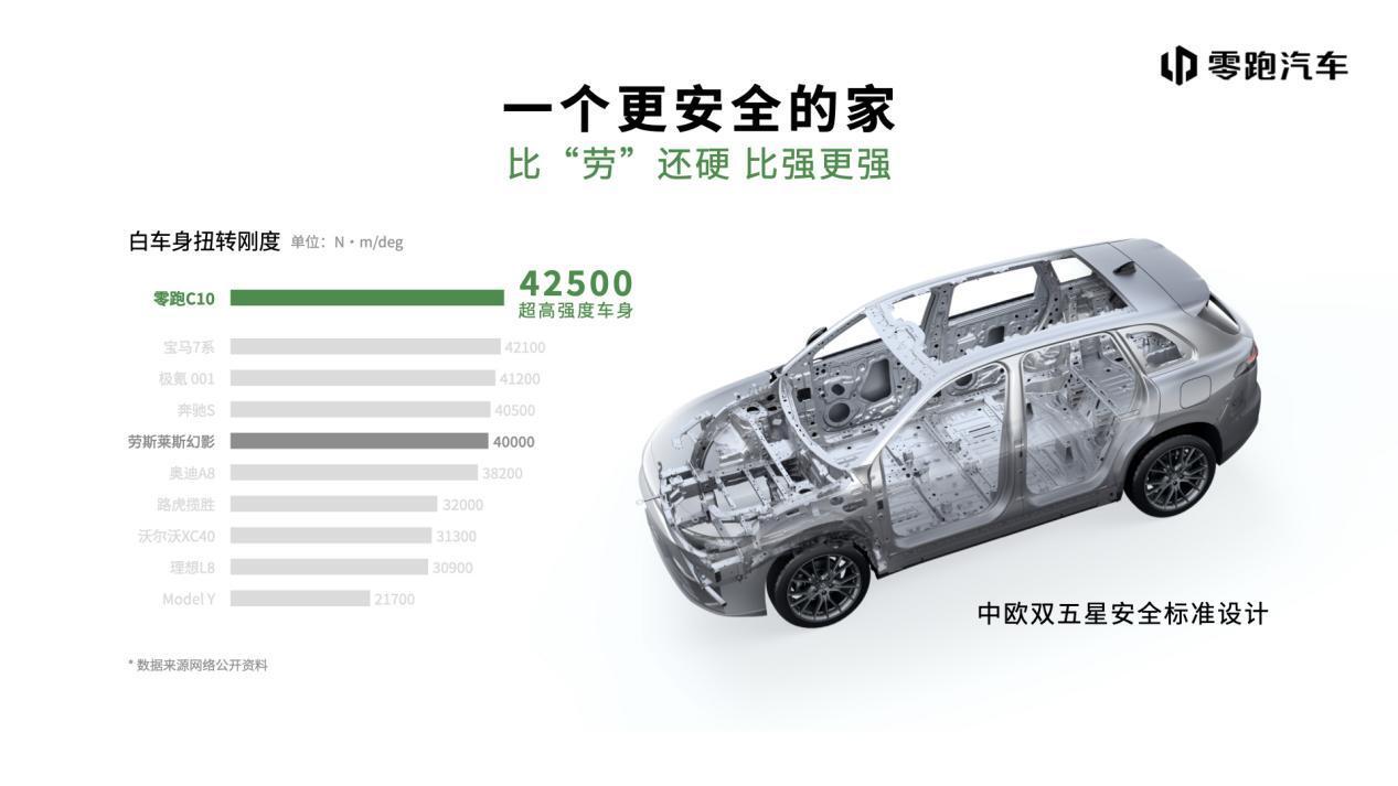 在安全方面,零跑C10更是采用中欧五星安全的全球高标准进行全新设计。车身采用CTC 2.0技术,一体式骨架结构设计。整车使用含铝合金的高性能材料占比高达73.6%,热成型钢高达21.8%,零跑C10车身扭转刚度高达42500 N.m/°,给予了家庭用户牢靠的安全感。