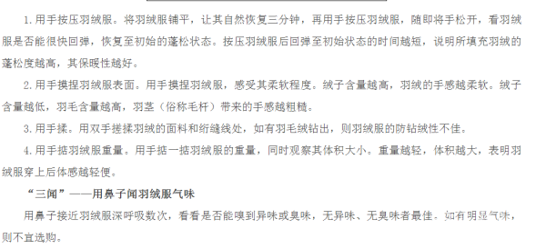 朱小芳说,关键看三个方面,一个是看执行标准,是不是执行14272国标标准;第二看标注绒子含量比例;第三看充绒量,一般来说绒子含量越高羽绒品质越好,保暖性越高,同样充绒量指的羽绒重量,充绒量越高羽绒服相对羽绒越多,保暖性也会越好。