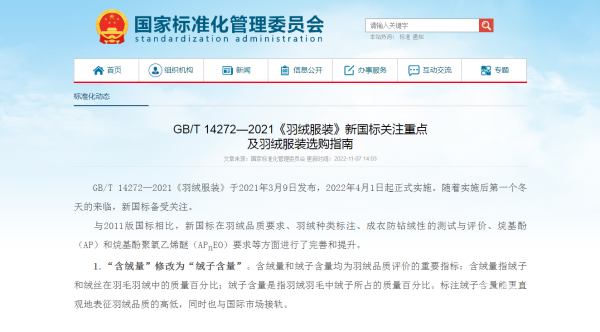 2022年4月,新版羽绒服装标准(GB/T14272-2021《羽绒服装》)开始实施,与2011版国标相比,新国标在羽绒品质要求、羽绒种类标注等方面进行了完善和提升。其中,将“含绒量”改为“绒子含量”。