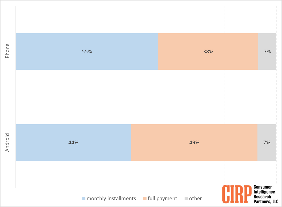 IT之家在此附上调查结果,55% 的美国 iPhone 购买者会选择按月分期计划,而安卓用户的比例为 44%。38% 的苹果 iPhone 用户会选择全款购买,而在安卓用户群体中占比为 49%。
