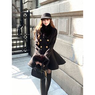 "圣日尔曼"法式毛领黑色收腰毛呢大衣2025年气质名媛风修身外套
