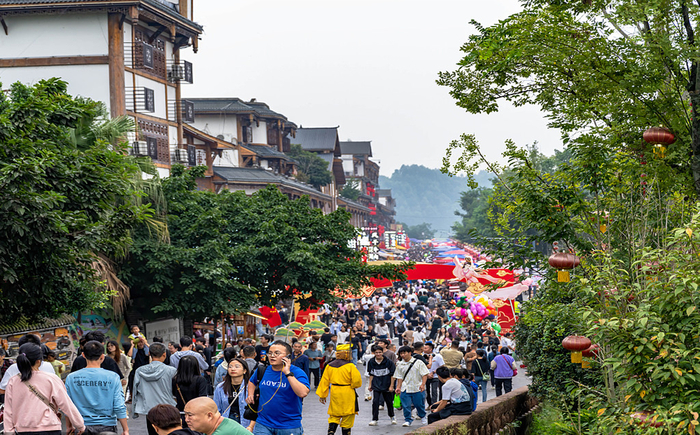 2023年10月1日,四川乐山,国庆期间,苏稽古镇游人如织。