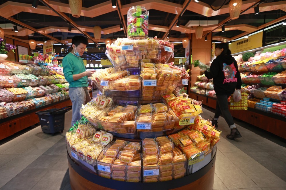 10月13日,顾客在贵州省黔东南苗族侗族自治州岑巩县一家超市选购食品。新华社发(唐鹏 摄)