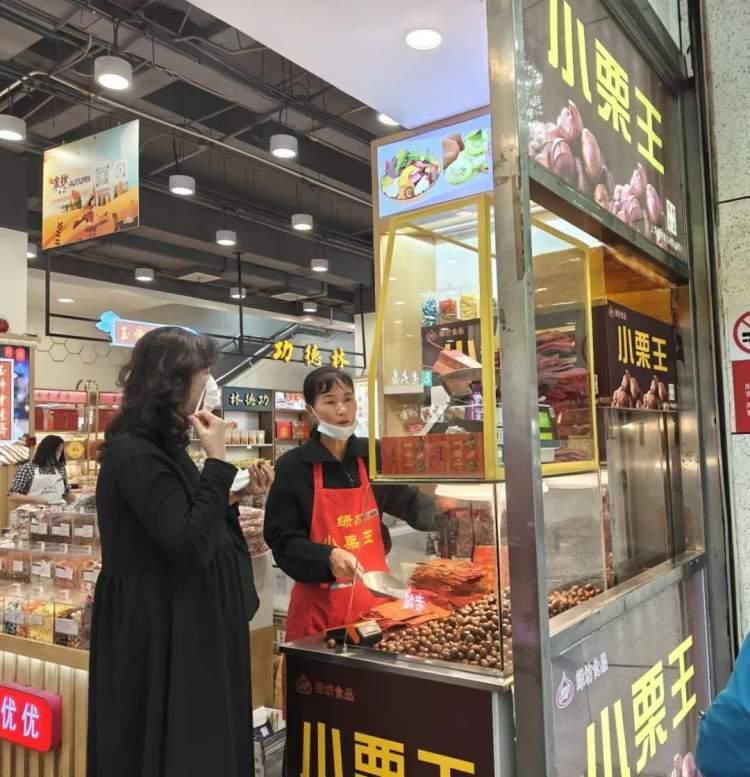 “要买栗子不?来,先尝尝。”小栗王的店员十分热情,不管买不买,先给尝一个。优质的服务吸引了不少路过的行人。