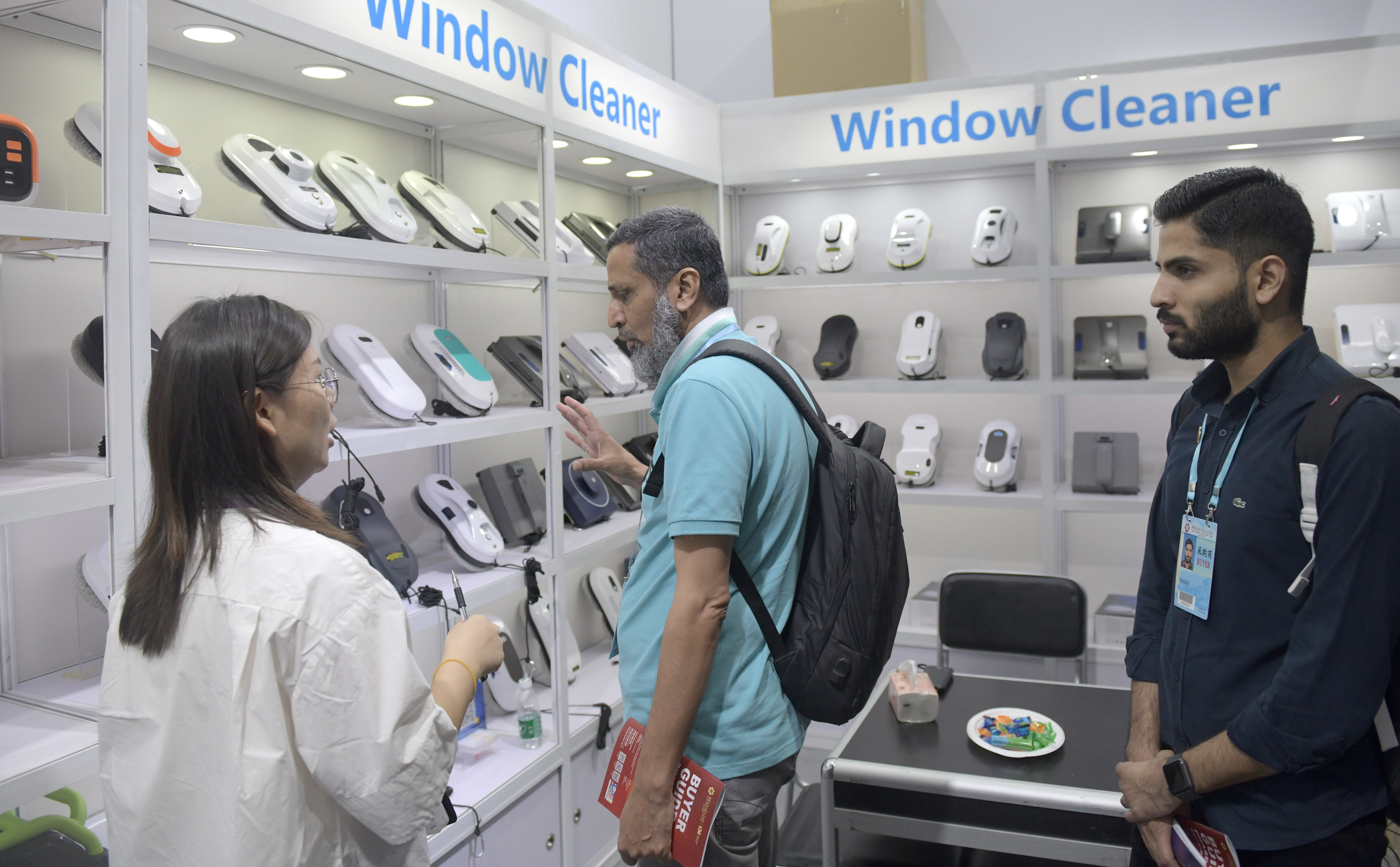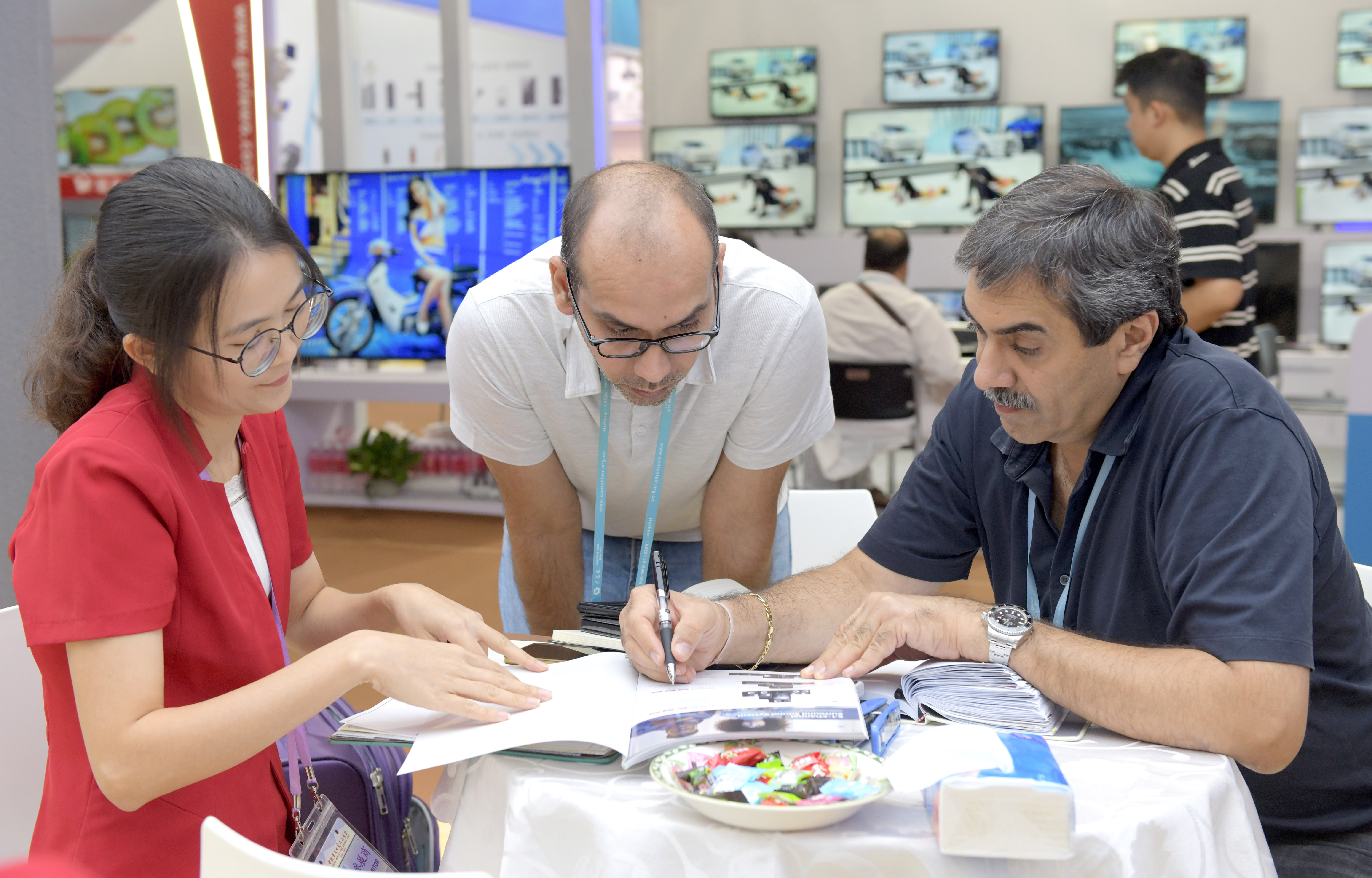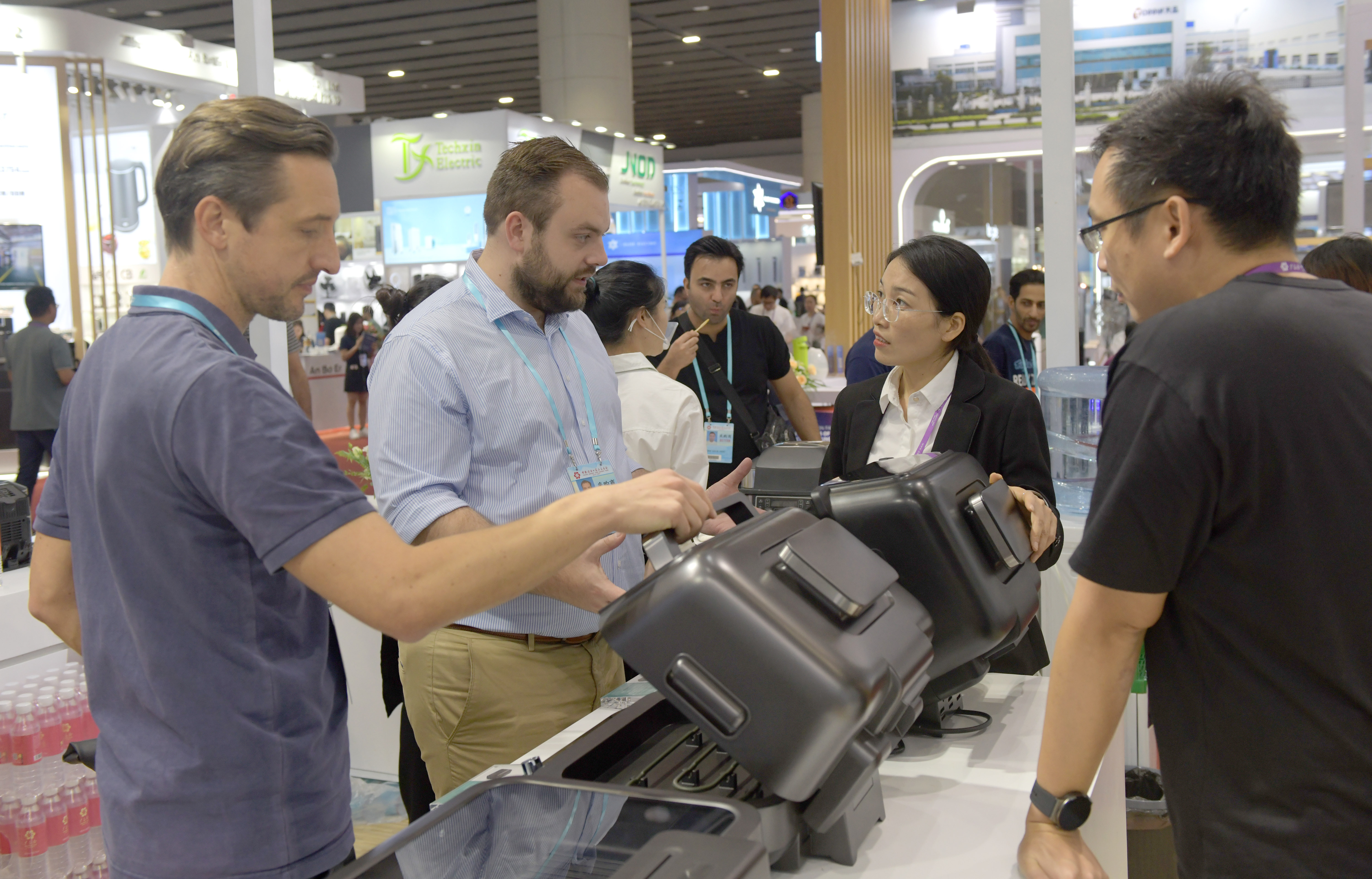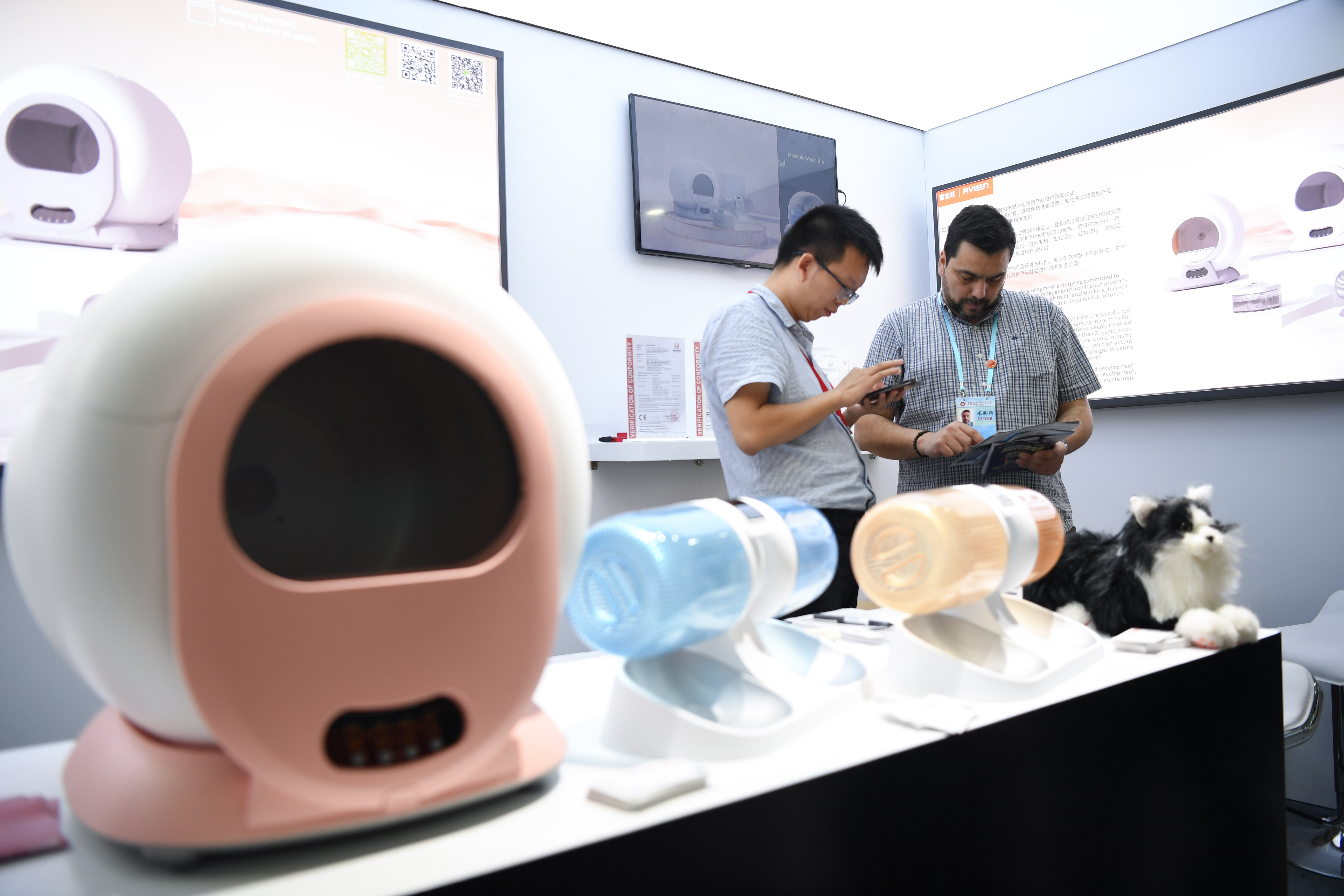10月15日,在一家智能猫砂盆产品展台,外国采购商在了解信息。新华社记者 邓华 摄