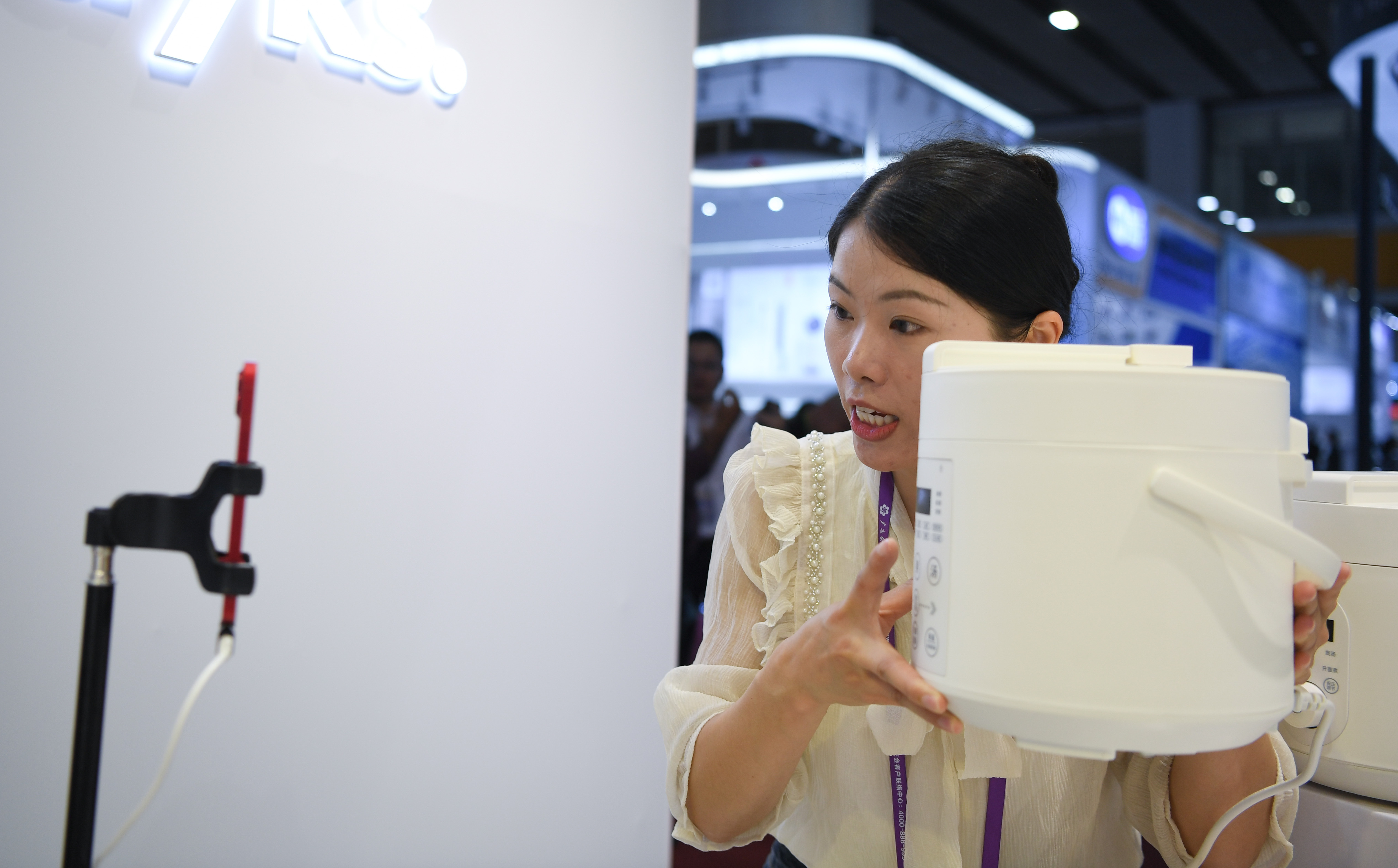 10月15日,参展的工作人员在展台直播介绍家电产品。新华社记者 邓华 摄