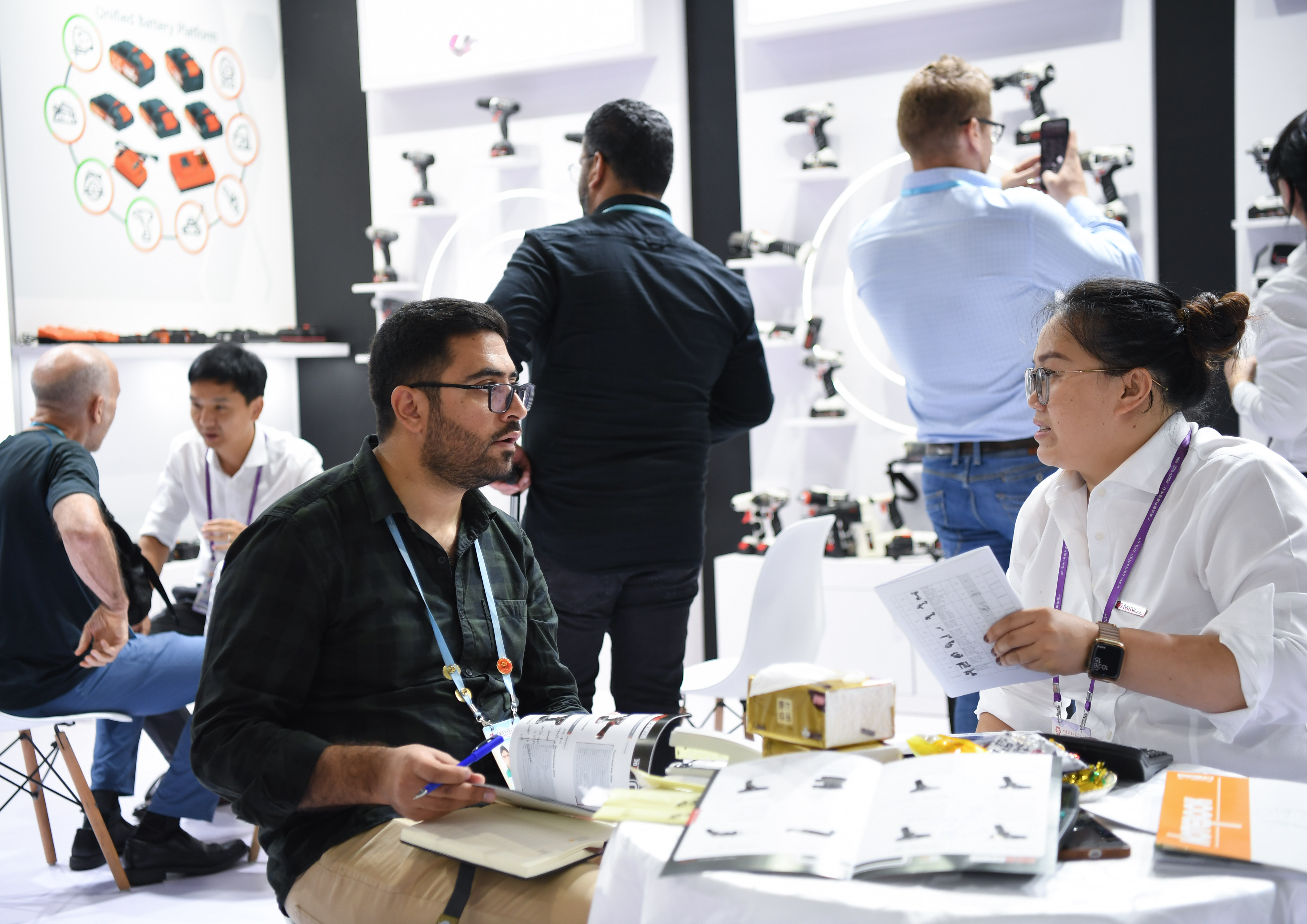 10月15日,在一家电动工具展台,外国采购商在洽谈业务。新华社记者 邓华 摄