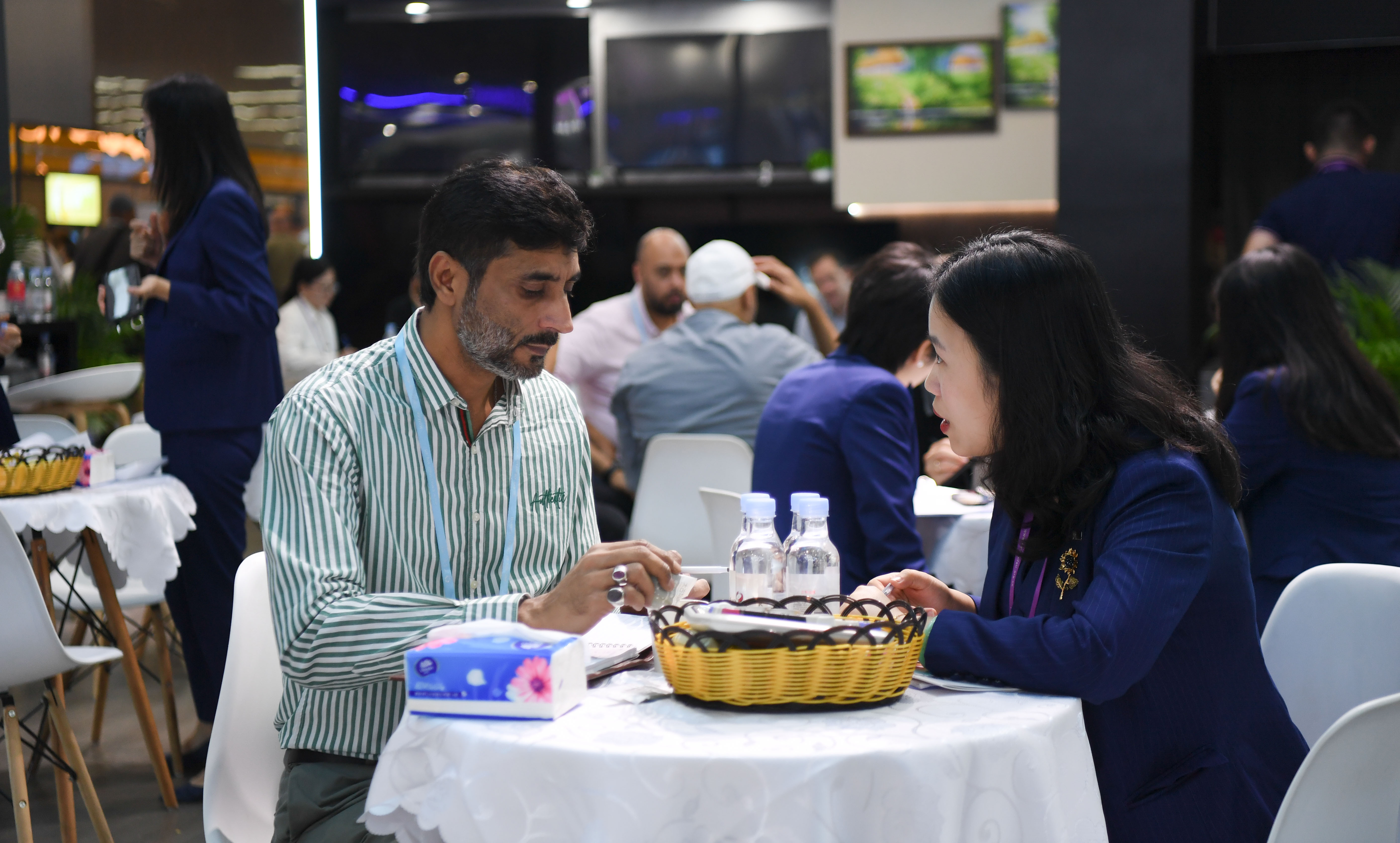 10月15日,客商在广交会上洽谈业务。新华社记者 卢汉欣 摄