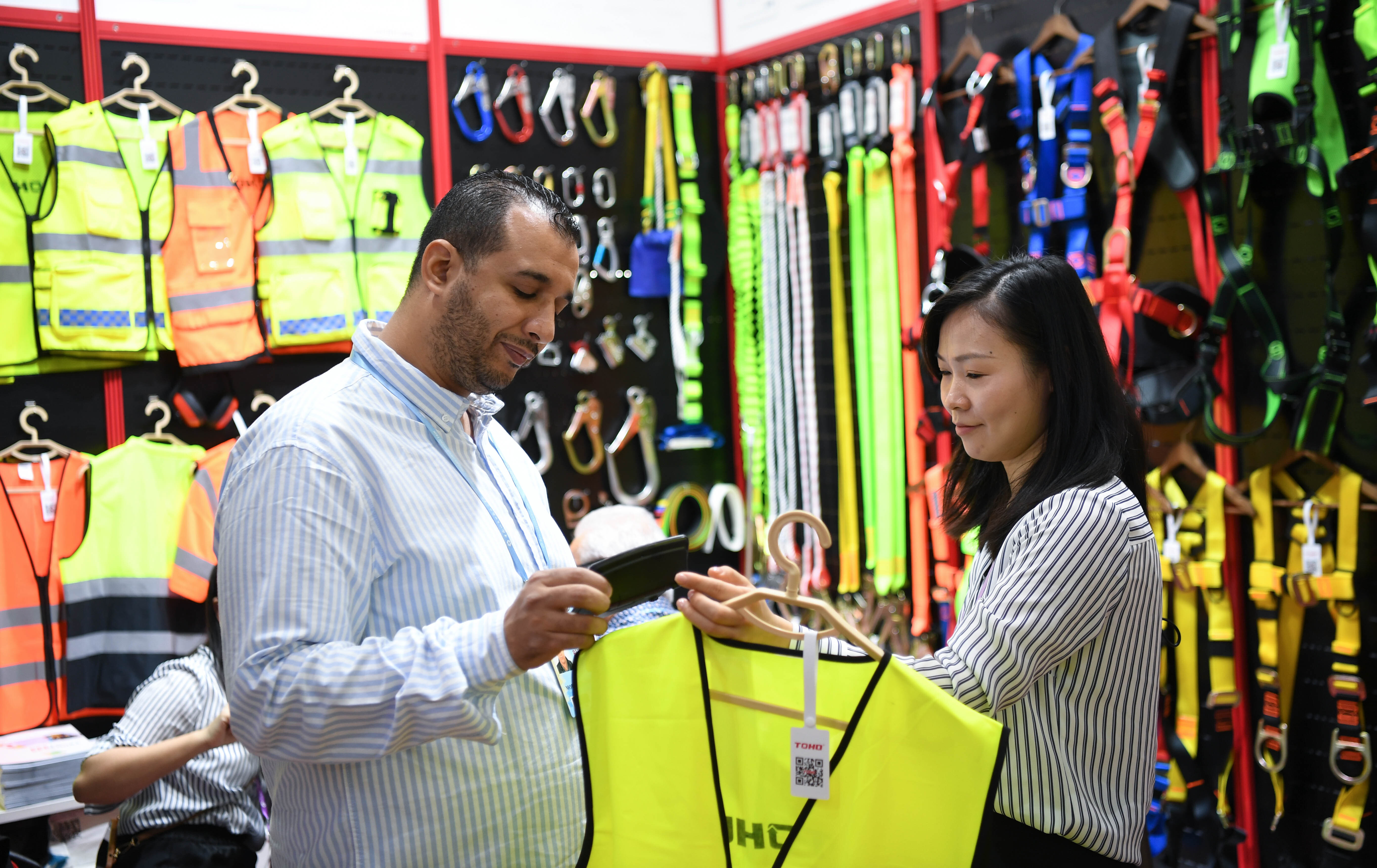 10月15日,外国采购商在了解劳保用品。新华社记者 邓华 摄