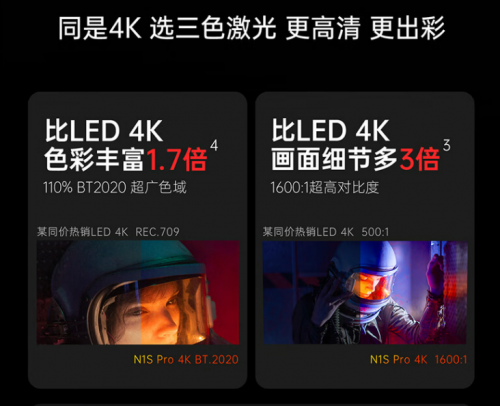 在画质提升到近乎完美的基础上,N1S Pro 4K还在分辨率方面较前一代N1系列有了巨大的升级。0.47英寸的DMD芯片将其分辨率提升到了标准的4K,效果是1080P的4倍之多,能够更好地将画质上限呈现出来。而在性价比方面,6K价格段的三色激光+4K投影,也是目前行业中的唯一。