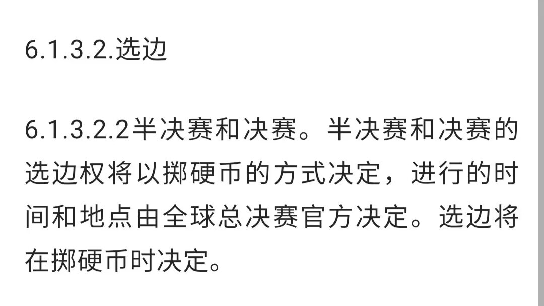 由此可见,在BO5的对局中,红色方Counter位发挥了很大作用,在四强赛之前,选边规则一直是高位种子优先,同位种子先抽到的优先,但四强半决赛和总决赛,以上规则不再适用,官方规定手册显示,选边权以抛硬币的方式获得,完全看战队的运气。