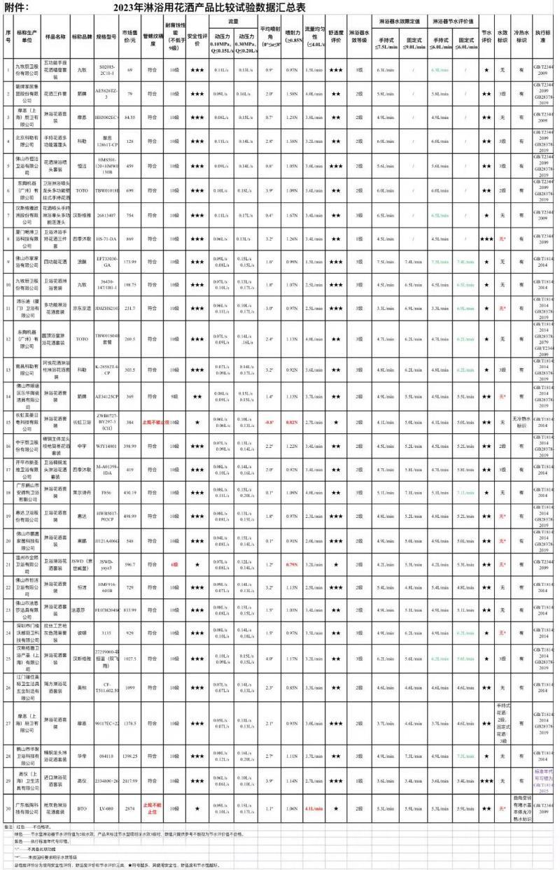 本次比较试验对花洒的螺纹管精度、耐腐蚀性能、平均喷射角、流量、喷射力、流量均匀性、水效限定性、节水评价值进行测试。根据测试结果,从使用安全性、舒适度评价和节水效果等方面对上述30款沐浴花洒样品进行综合评价,整体性能较好(使用安全性好、达到2级及以上水效,舒适度体验较好)的有14款样品,其中5款手持花洒分别是:摩恩 HH5002EC+731+710、科勒 翠思 12861T-CP、恒洁 HMS501-120+HMWE121-150B、TOTO TBW01018BVD、四季沐歌 HS-71-DA;9款套装花洒分别是:中宇 WJY14801、四季沐歌 M-A01398-1DA、惠达 HWB5017-P02CP、东鹏 JJ121A406G、恒洁 HMF916-601B、法恩莎 FE07H204SC、美标 CF-T511.602.50、摩恩 90117EC+2293ECA+M22061、高仪 2334800+2669800C。