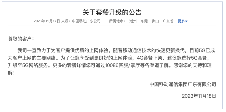 广东移动公告:4G套餐下架,建议客户选择5G套餐