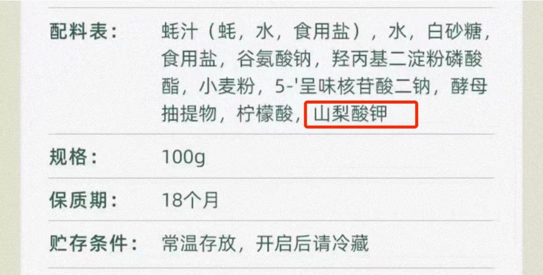 对商家而言,不添加防腐剂,意味着需要更高的工艺标准来实现灭菌,对生产设备及生产环境的要求也更高。因此,为了延长蚝油的保质期,山梨酸钾等防腐剂也被添加在蚝油中。