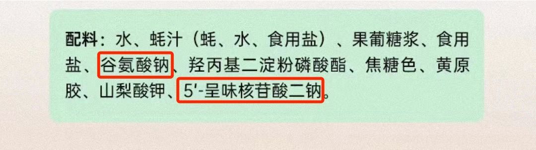蚝汁的鲜,用味精代替。在蚝汁含量少的情况下,一些蚝油会添加谷氨酸钠,也就是常见的味精用来增强鲜味。此外,5’-呈味核苷酸二钠等增味剂也被用于与谷氨酸钠搭配使用,进而增强蚝油的鲜味。