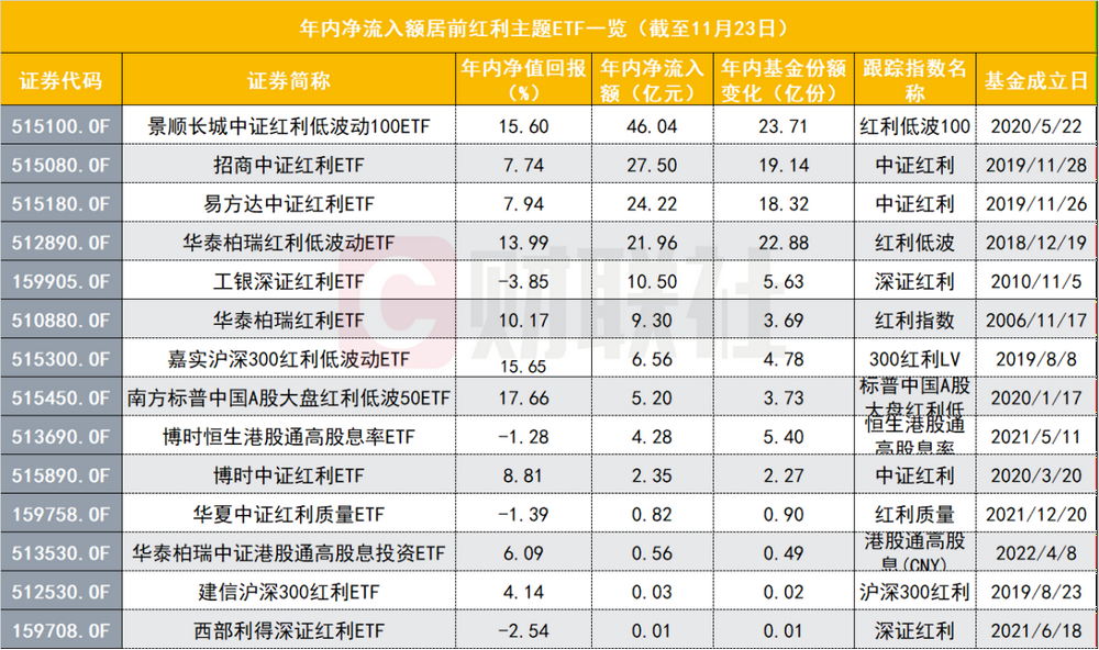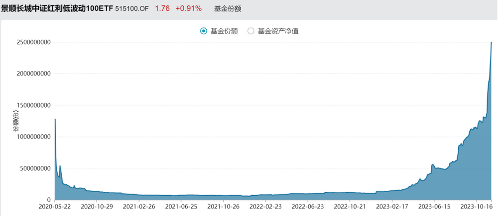 该ETF的基金份额和基金规模双双创下新高,分别为25亿份、44.05亿元。从基金份额变化的情况看,四季度以来,基金份额增长的速率明显加快。Wind数据显示,截至11月23日,景顺长城中证红利低波动100ETF年内合计流入41.77亿元,位居所有策略型ETF之首,仅四季度以来即净流入24.29亿元。
