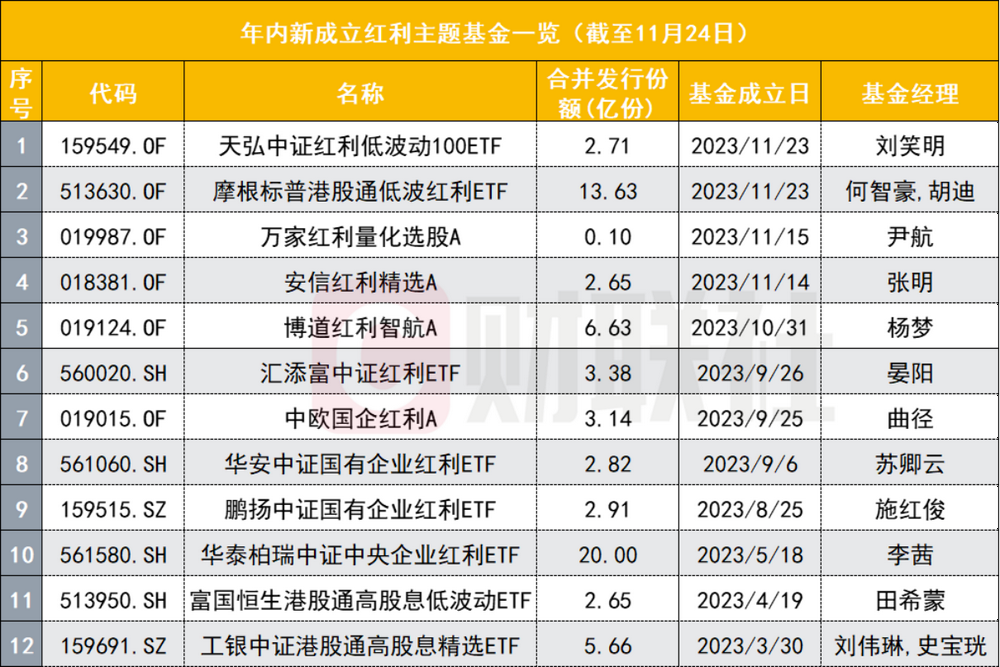 一方面是资金的持续流入;另一方面是基金公司的细化布局。从产品数来看,随着又一只红利主题ETF在11月24日成立,市场现存的红利主题基金达110只,其中的12只产品均为年内新成立。