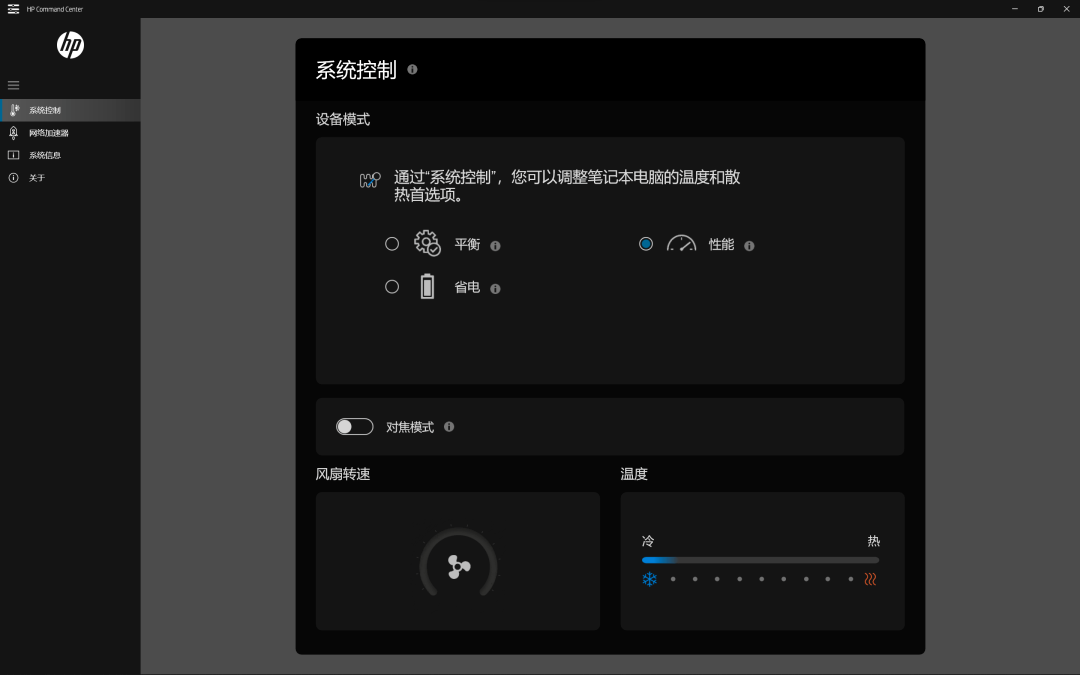 在内置的惠普 “ 控制中心 ” 程序中,我们还能手动调整性能、平衡、省电等模式切换,以应对不同的使用场景。