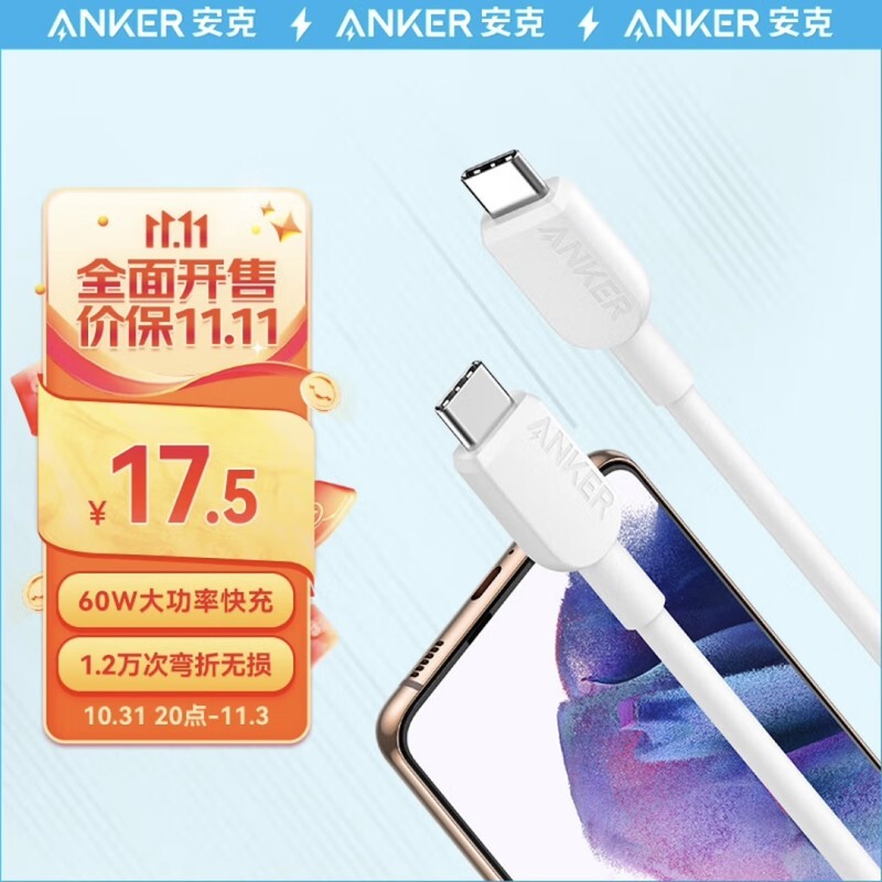安克【双Type-C】数据线,长度0.9m,最高支持60W大功率快充,官方表示1.2万次弯折无损,参考售价17.5元。
