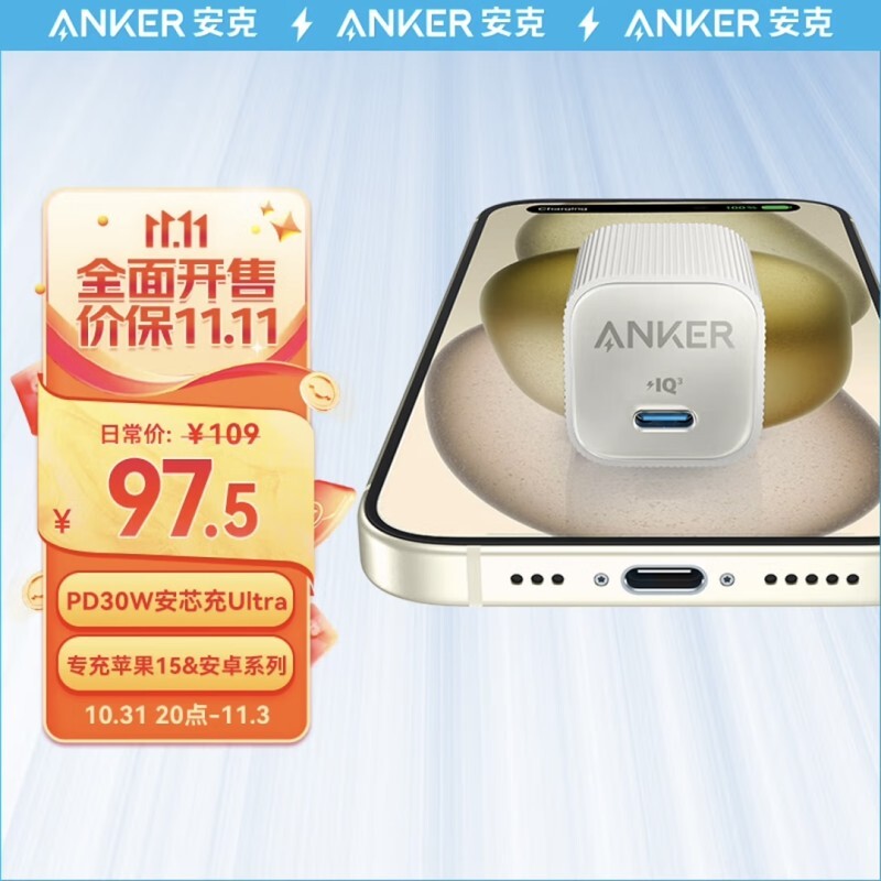 安克【30W氮化镓】安心充Ultra,氮化镓可折叠设计,iPhone 15全系通用,提供白、绿、蓝、黑、紫霞粉五款配色可选,参考售价97.5元。
