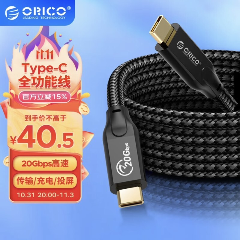 奥睿科Type-C全功能线,支持100W+20Gbps+4K,编织材质,可用于日常充电、传输以及投屏,参考售价40.5元。