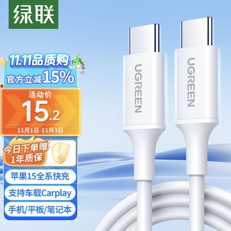 绿联【PD60W】苹果15闪充1米数据线,最高支持60W充电功率,可以为手机、平板、笔记本充电,同时支持车载Carplay,参考售价15.2元。