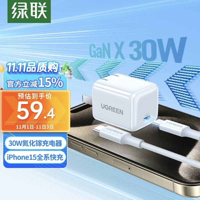 绿联【30W氮化镓】iPhone 15快充套装-白,30W快充头+1.5m双Type-C口数据线,采用氮化镓材质,体积小,重量轻,并且可折叠设计,非常易于携带,参考售价59.4元。