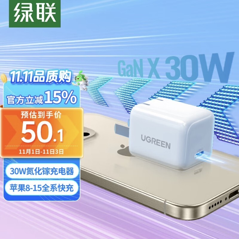 绿联【30W氮化镓】iPhone 15全系快充头,与前面绿联充电套装同款的30W快充头,提供黄、蓝、白三种配色,支持iPhone 8-iPhone 15全系快充,参考售价50.1元。