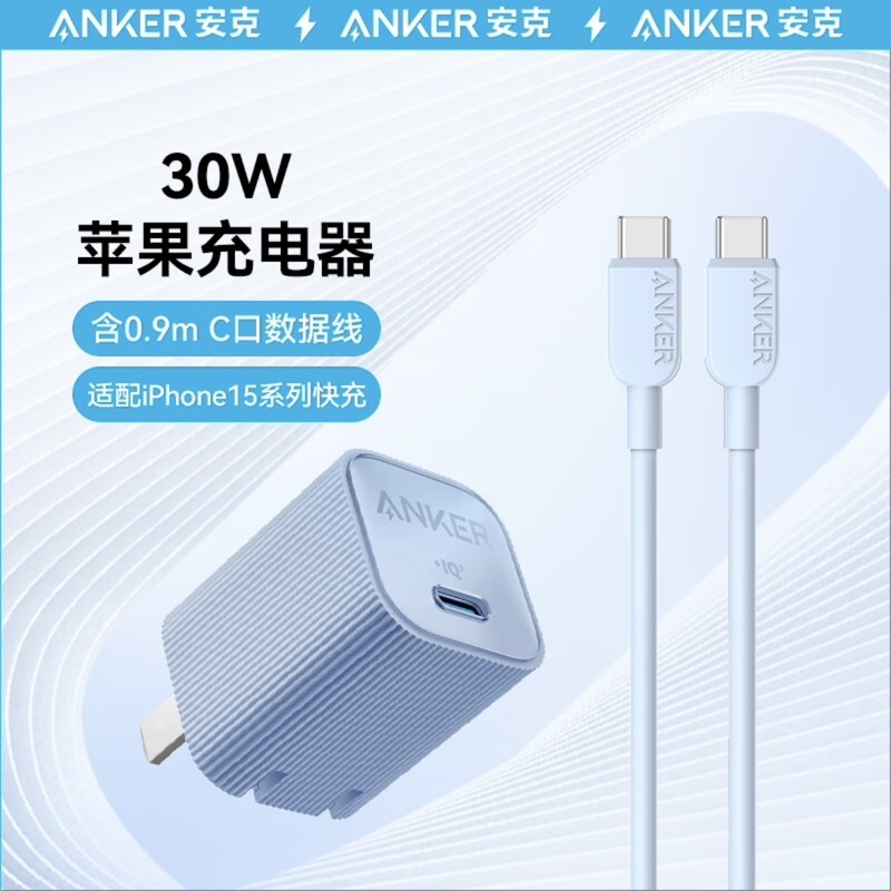 安克【C to C】30W套装,【升级款】含0.9m双C口数据线,充电头氮化镓材质,可折叠设计,提供蓝、紫两款配色,参考售价136.1元。若搭配1.8m双C口数据线,则提供蓝、紫、黑、白四种配色,参考售价为143.3元。